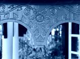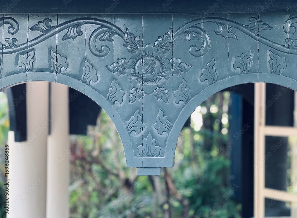 A detailed close-up of traditional Lao wooden carvings, featuring intricate floral and swirling scrollwork motifs, painted in a muted teal or grey-blue color.