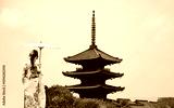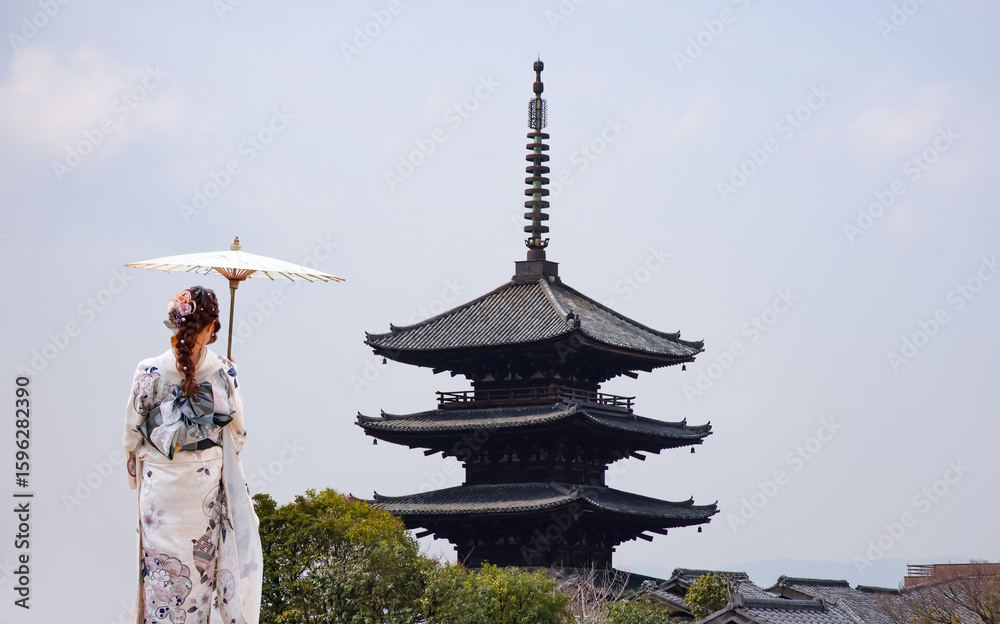 Japanese woman wearing japanese traditional kimono, Pagoda of Kiyomizudera temple in the background - Kyoto, Japan.