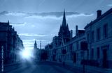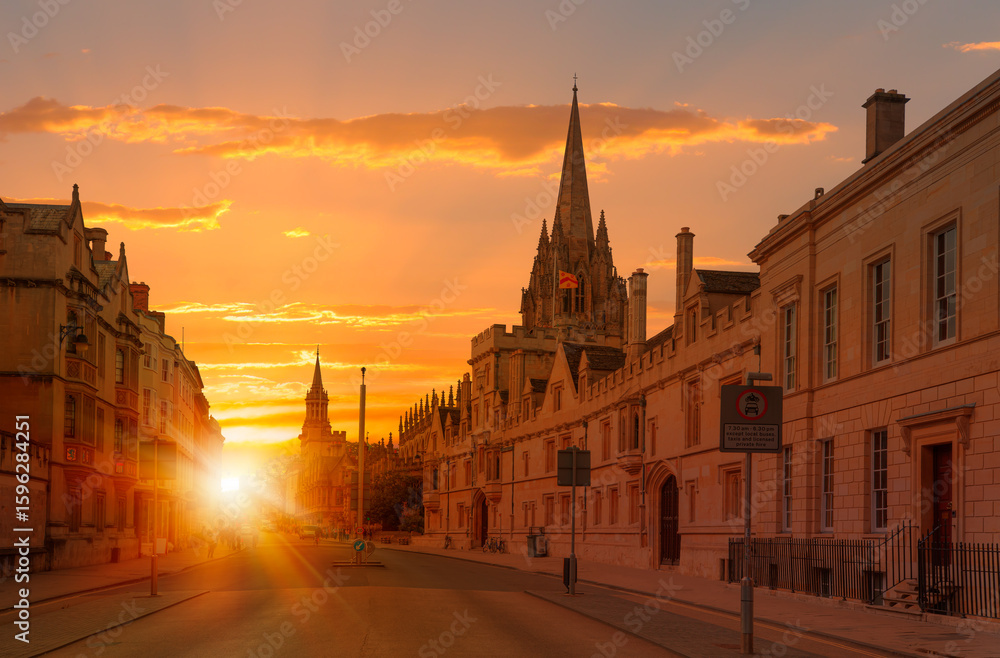 View of High Street road with Cityscape of Oxford at sunset - St Mary's University Church