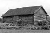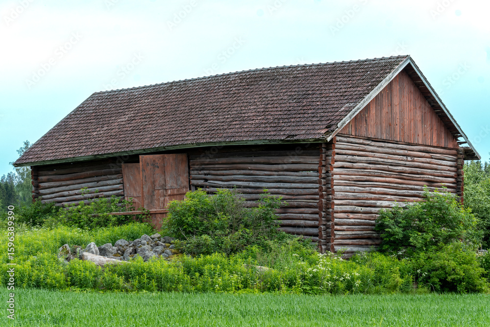 Rustic Wooden Barn Amidst Lush Greenery Under a Cloudy Sky
