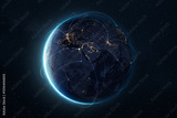 Digital connections around the world — planet Earth at night with glowing network lines representing global communication, data transfer, and worldwide internet connectivity in space.