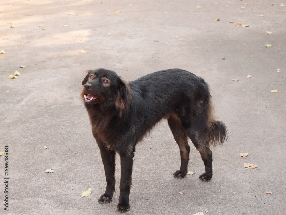 A Playful Black Dog Standing Happily on the Pavement, Enjoying Its Day in the Sunlight