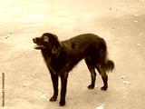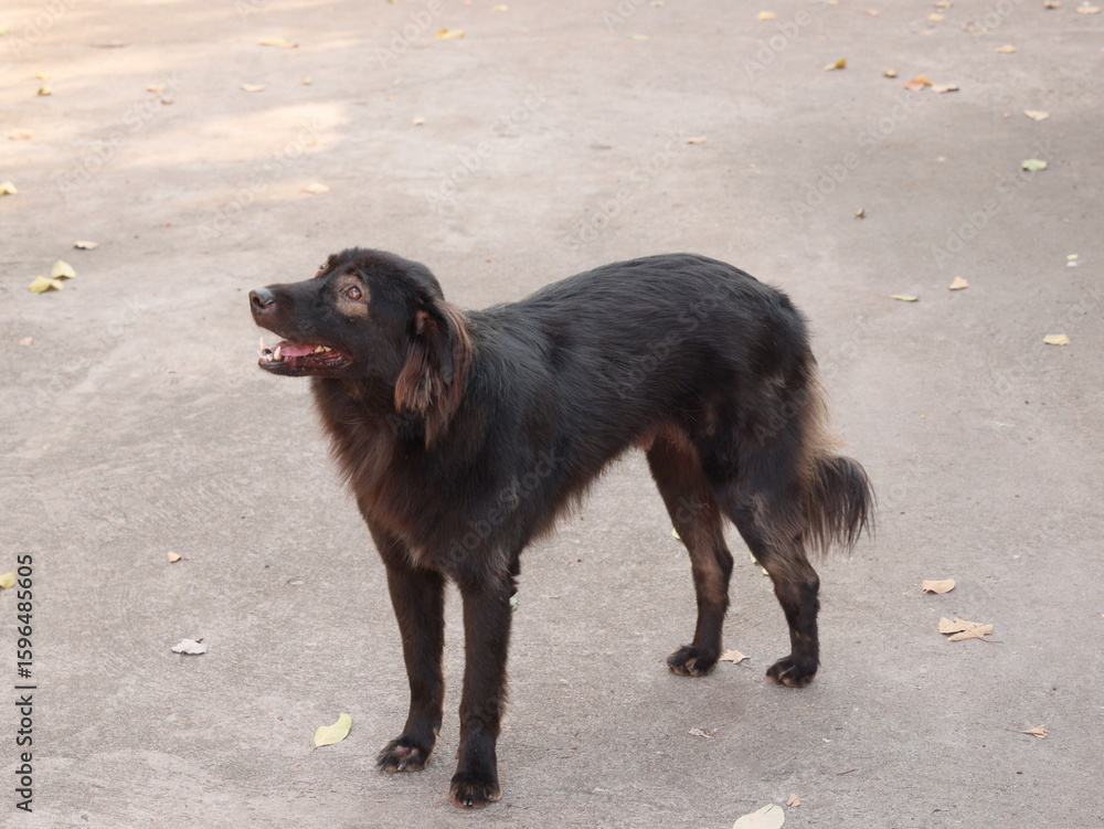 A Playful Black Dog Standing on the Pavement, full of energy and joy, ready for adventure