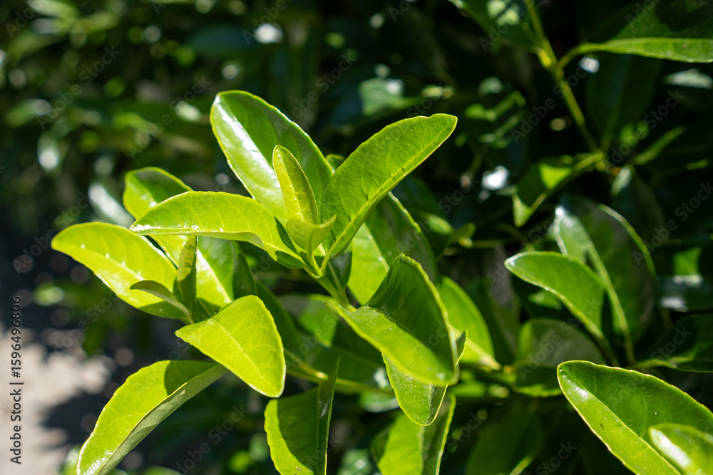 Close-up View of Vibrant Green Leaves on a Shrub in a Sunny Garden During Midday in a Suburban Area