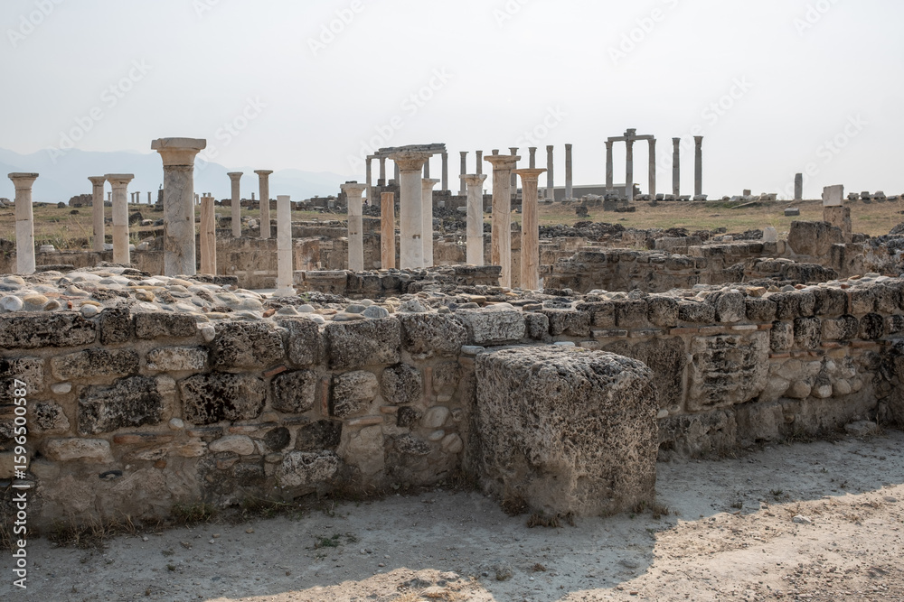 Explore the Historical Ruins of the Ancient Town of Laodikeia Featuring Stone Structures and Towering Columns in a Serene Landscape