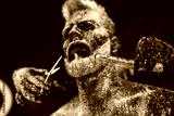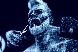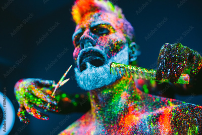Concept. A bearded man in Barbershop. A stylish bearded man is trimmed in Barber Shop. The man is decorated in ultraviolet powder.