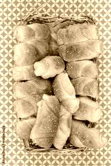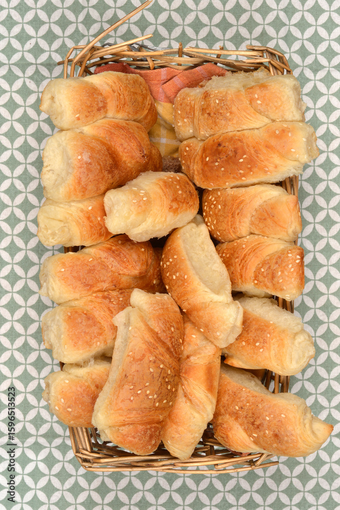 A wicker basket full of freshly baked crescent rolls sprinkled with sesame seeds on a green tablecloth with a geometric pattern