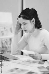Stressed office woman reading document with worried face and messy paperwork on desk in workplace