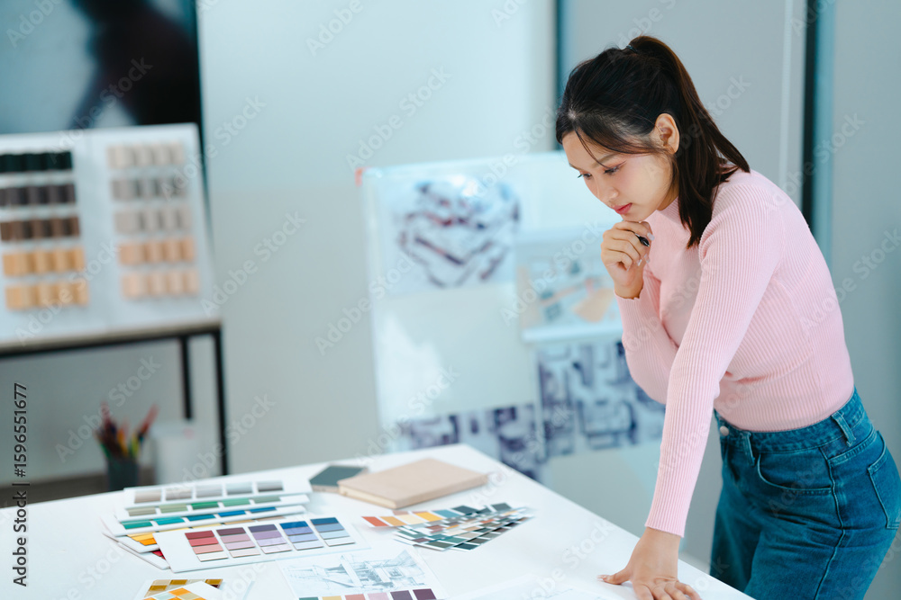 Designer reviewing office interior layout plan with paper drafts and material samples