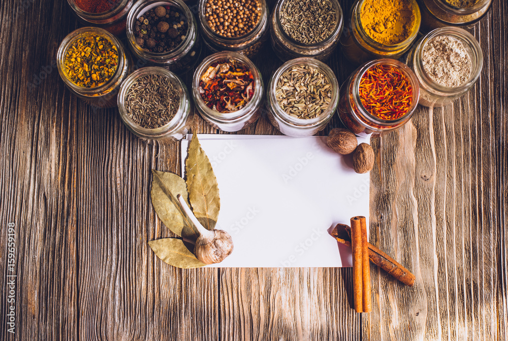 Various colorful kinds of spices on rustic wooden table, top view with copy space