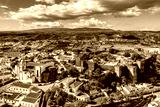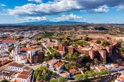 View of Silves town buildings with famous castle and cathedral, Algarve region, Portugal. Walls of medieval castle in Silves town, Algarve region, Portugal.