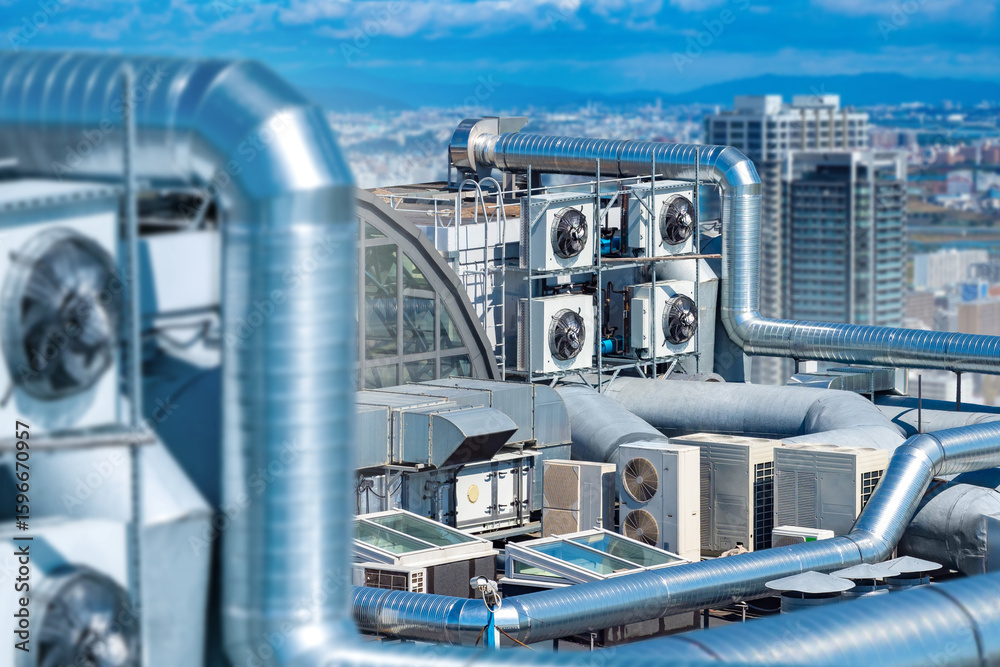 HVAC system on building rooftop with industrial ventilation pipes and air conditioning units, climate control infrastructure, urban technology.