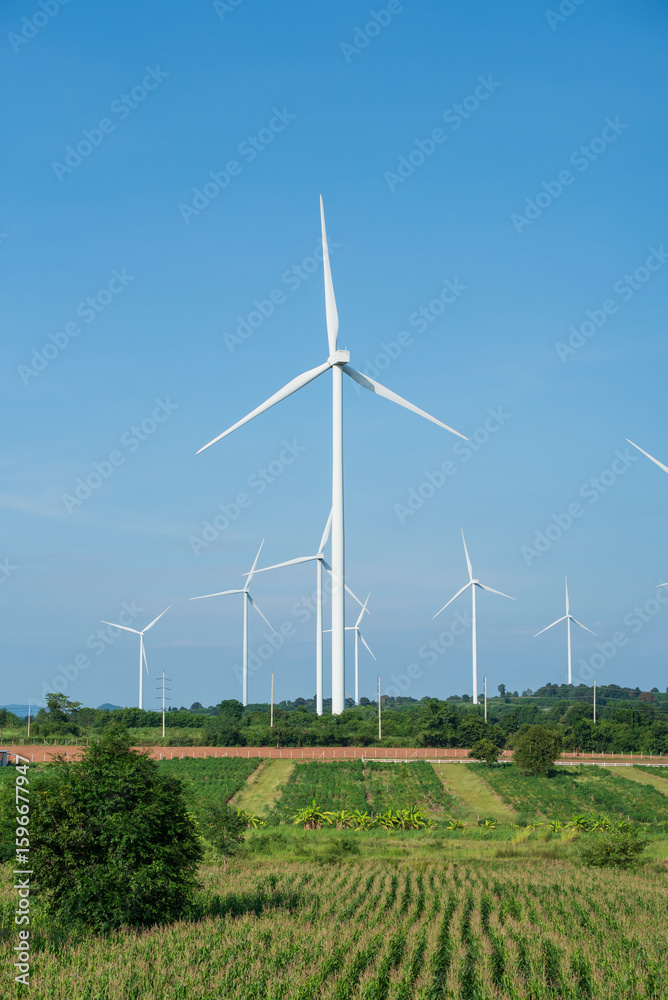 Electricity generating station, Wind turbines power generator in agricultural fields with the blue sky, Alternative Energy Windmill Farm