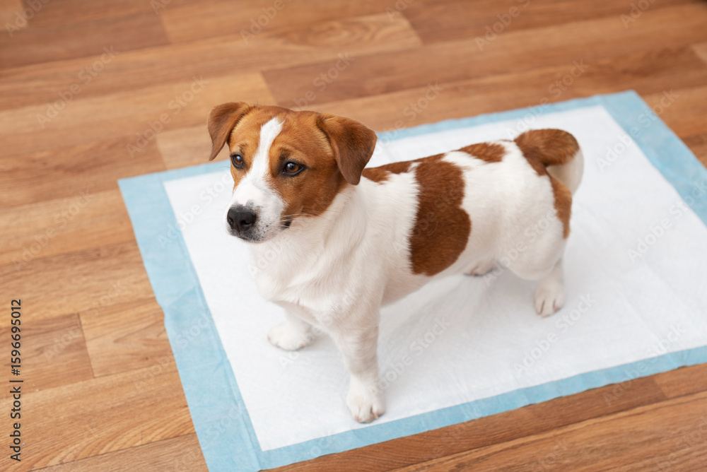 Jack Russell Terrier dog stands on a hygienic daily diaper for pets