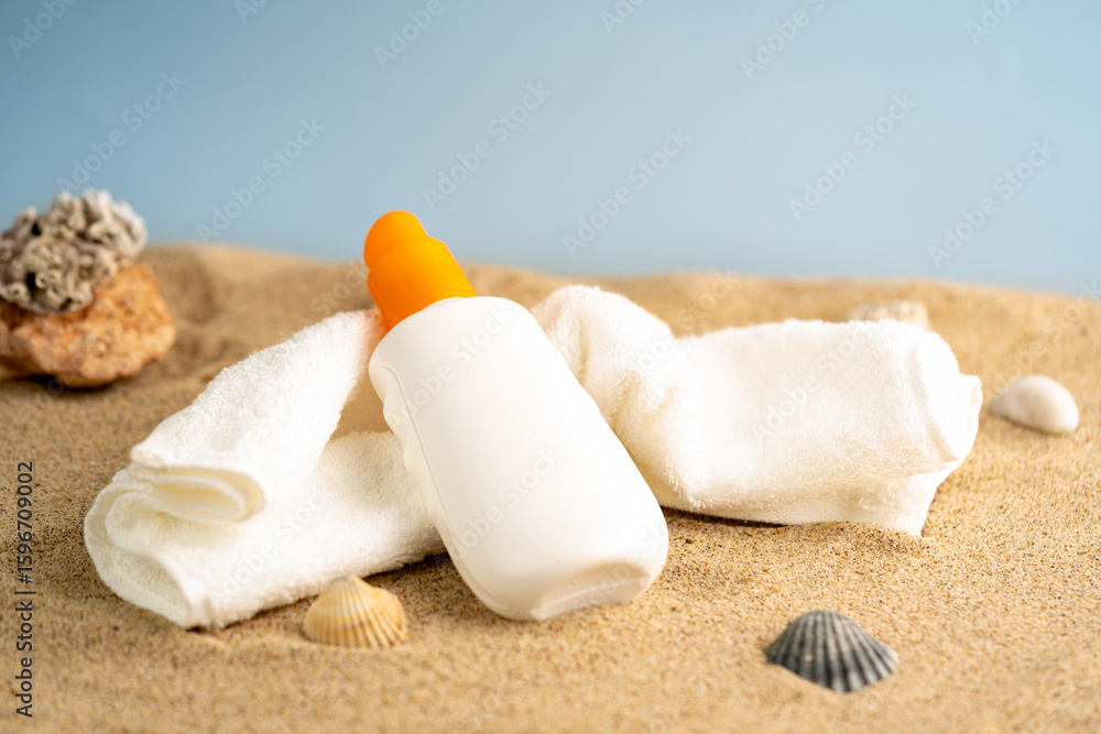 Bright sun care bottle on sand with coral, shells, white towel, and palm leaf. Summer vacation scene for skincare branding, SPF mockups, or beach wellness ads