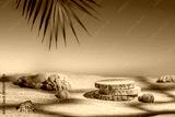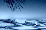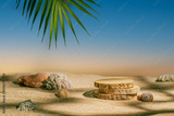Natural product display scene with wood podiums on beach sand, palm leaf shadow, and seashells. Ideal for eco skincare mockups, organic cosmetics branding, or summer wellness visuals