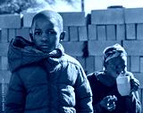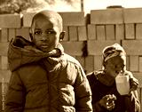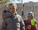 Africa village, portrait single african child, outdoors in the yard, wearing jacket with hoodie, mother drinking tea