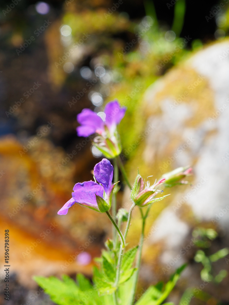 A Delicate Purple Wildflowers Bloom Beside a Rocky Stream in Nature