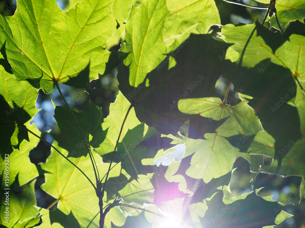 A Sunlight Filtering Through Vibrant Green Maple Tree Leaves on a Bright Summer Day
