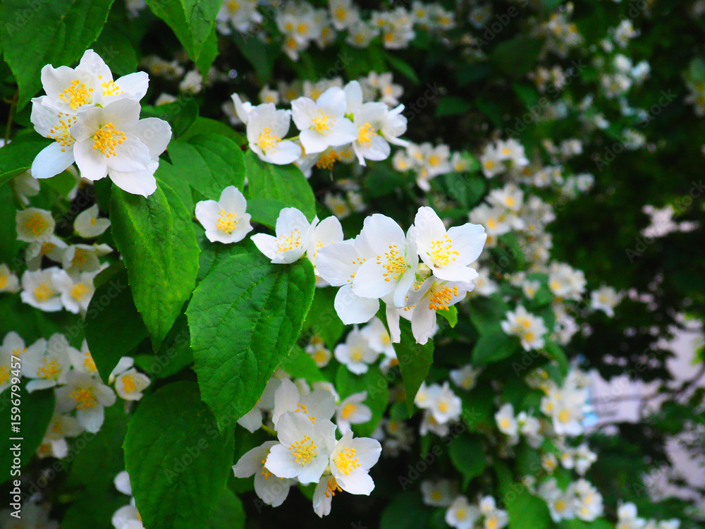 Delicate White Jasmine Flowers Blooming on Green Bush