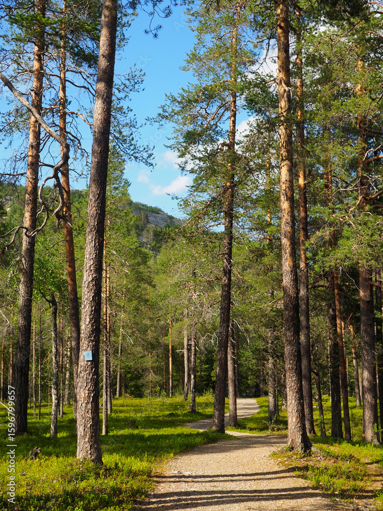 A sunlit path winds through a vibrant green forest with tall pine trees reaching for the blue sky