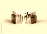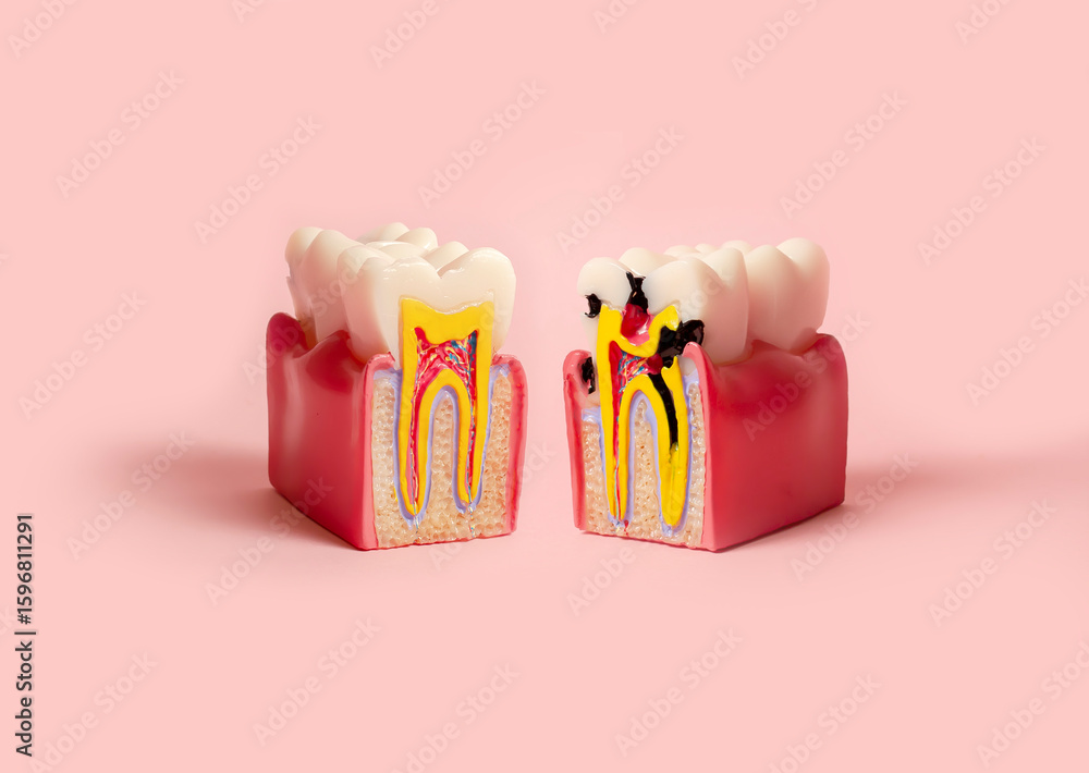 Dental 3D model of the dental cavity of the mouth in section. On the model there is a healthy tooth. Creative concept on a pastel background