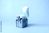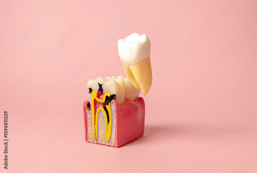 Dental 3D model of the oral cavity in section. On the model there is a tooth damaged by caries. Creative concept on a pastel background