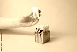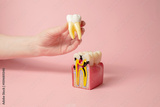 Dental 3D model of the oral cavity in section. On the model there is a tooth damaged by caries. Creative concept on a pastel background