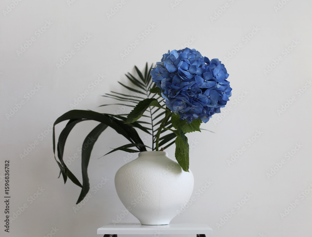 Blue hydrangea flower in white vase on gray interior. Minimalist still life. Light and shadow nature background.