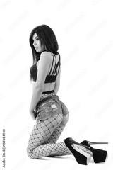 Sexy young stylish hipster girl posing, beautiful ass in trendy jeans shorts with fishnet pantyhose