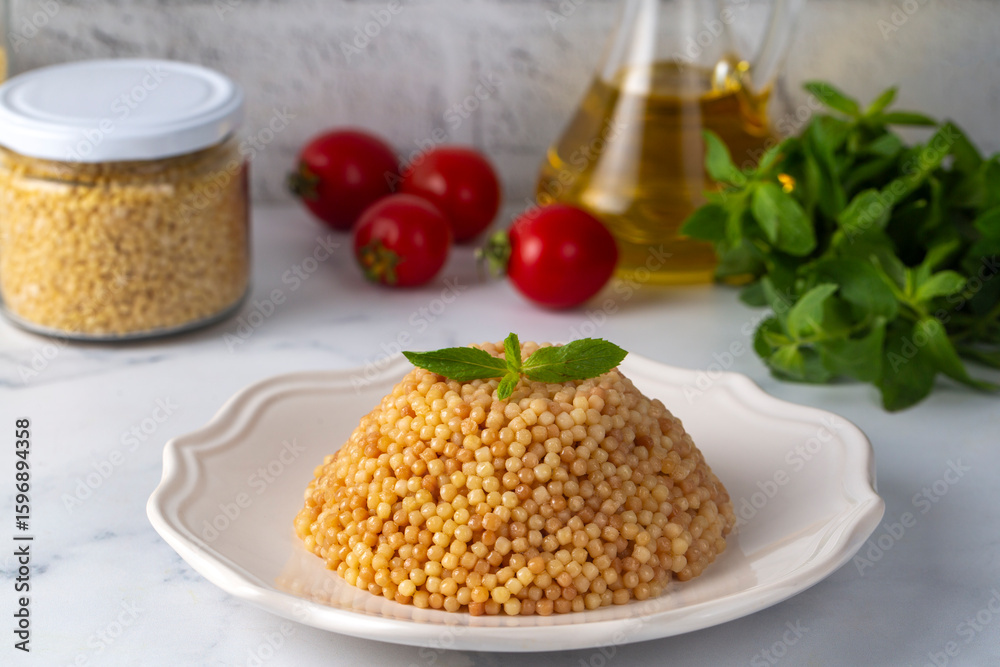 Couscous - Kuskus ; A type of pasta dish, accepted as the main dish in Maghreb countries, prepared by shaping moist semolina wheat into balls and coating them with wheat flour.