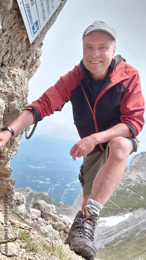 Happy man on Westliche Karwendelspitze (2385 m) in bavarian Alps, Germany.