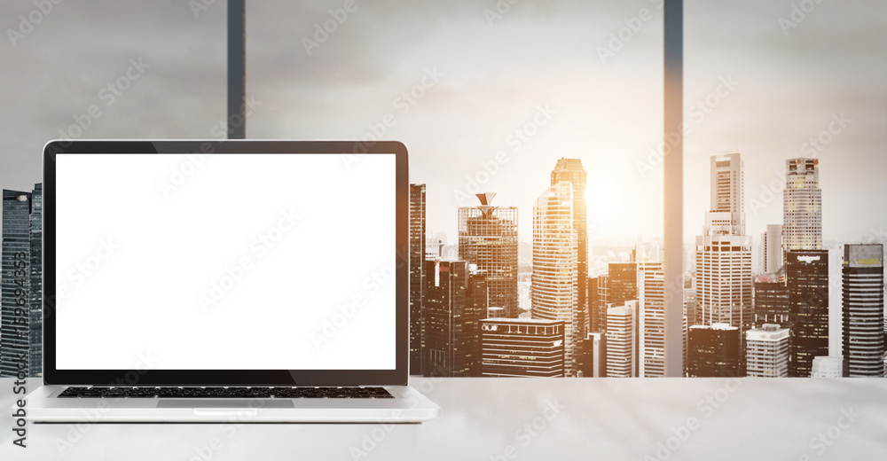 Laptop on table in office with panoramic sunset view of modern downtown skyscrapers at business district, blank screen