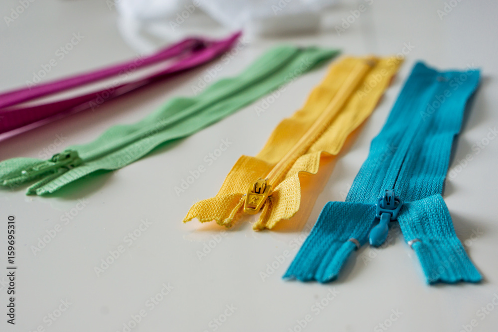 Close-up of colored zippers. Different colors suitable for summer fresh clothes. Shallow depth of focus.