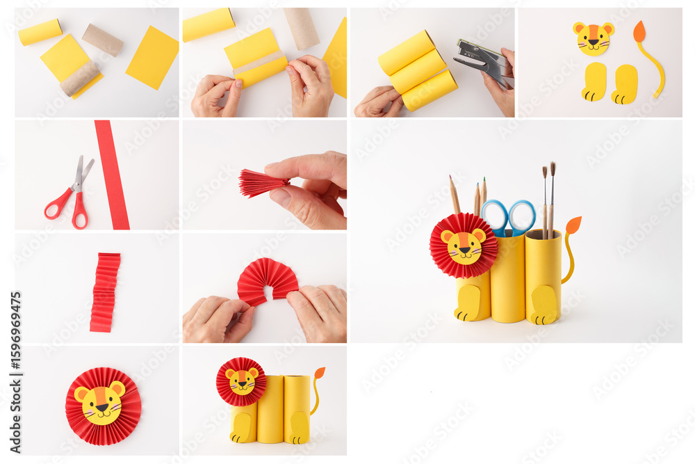 Whimsical lion-shaped desk organizer with yellow paper containers and art tools, perfect for craft promotions, educational content, kids product design, or creative tutorials