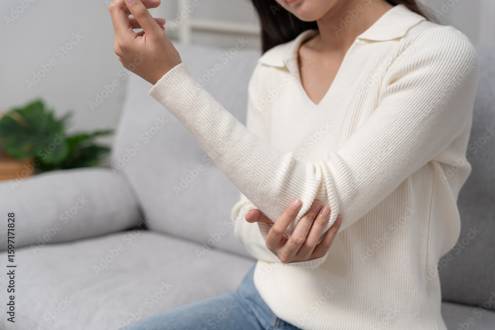 woman holding on elbow and while and suffer from unbearable pain health and problems, chronic shoulder pain, shoulder ache in office syndrome, scoliosis, herniated disc, muscle inflammation