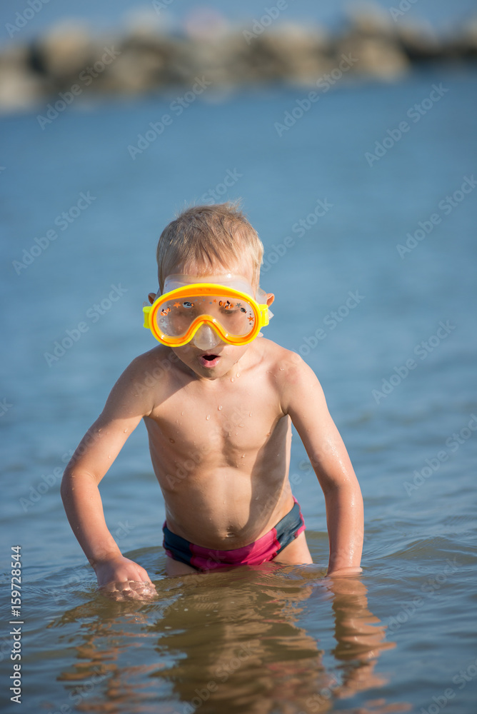 Little boy with snorkel by the sea. Cute little kid wearing mask and flippers for diving at sand tropical beach. Ocean coast.