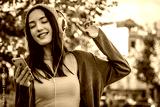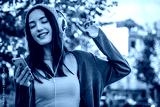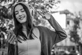 Smiling young woman holding mobile phone listening to music through headphones at park