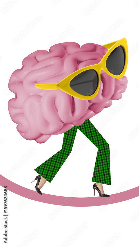 Surreal collage art of walking brain in sunglasses and high heels expressing intelligence with confident attitude. Concept of fintech education, social media posters, pop-art merchandise.