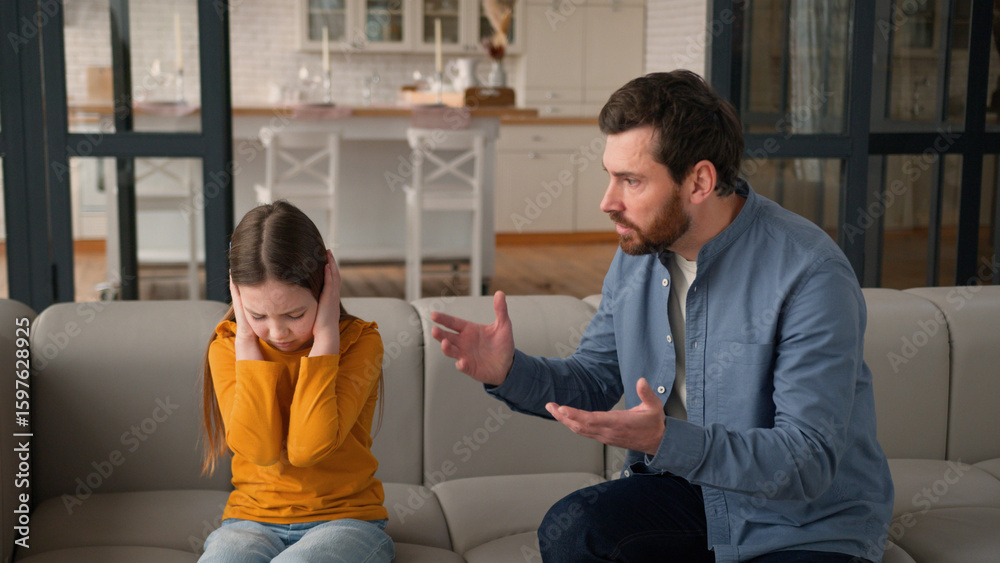 Furious Caucasian man father male screaming at sad afraid child girl punishing for bad behavior argument daughter little kid trouble irritated parent dad shouting at home quarrel problem family abuse