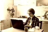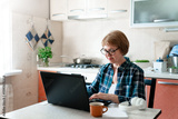 Middle-aged woman working from home office. Workplace in kitchen with laptop. Happy senior freelancer managing finances. Personal budgeting, financial literacy on retirement, small slow business
