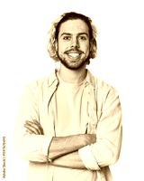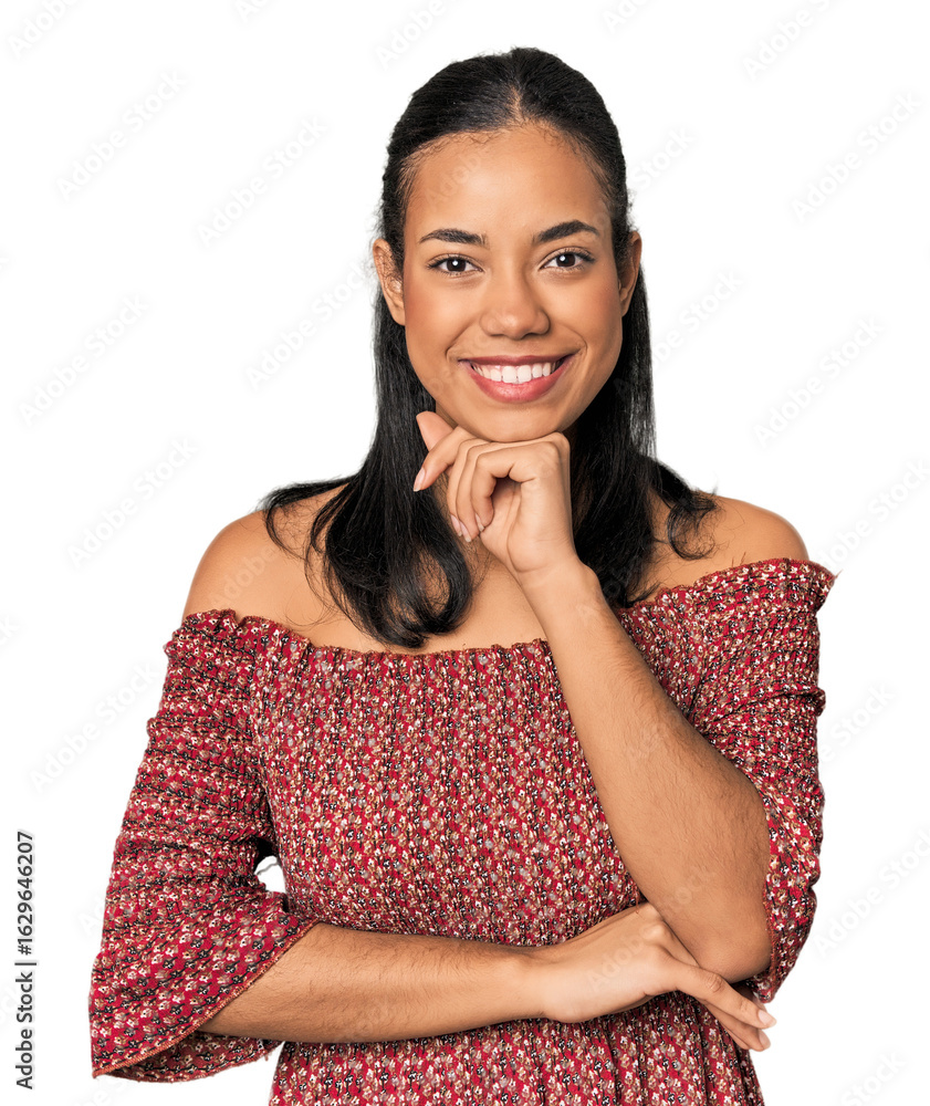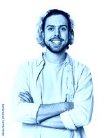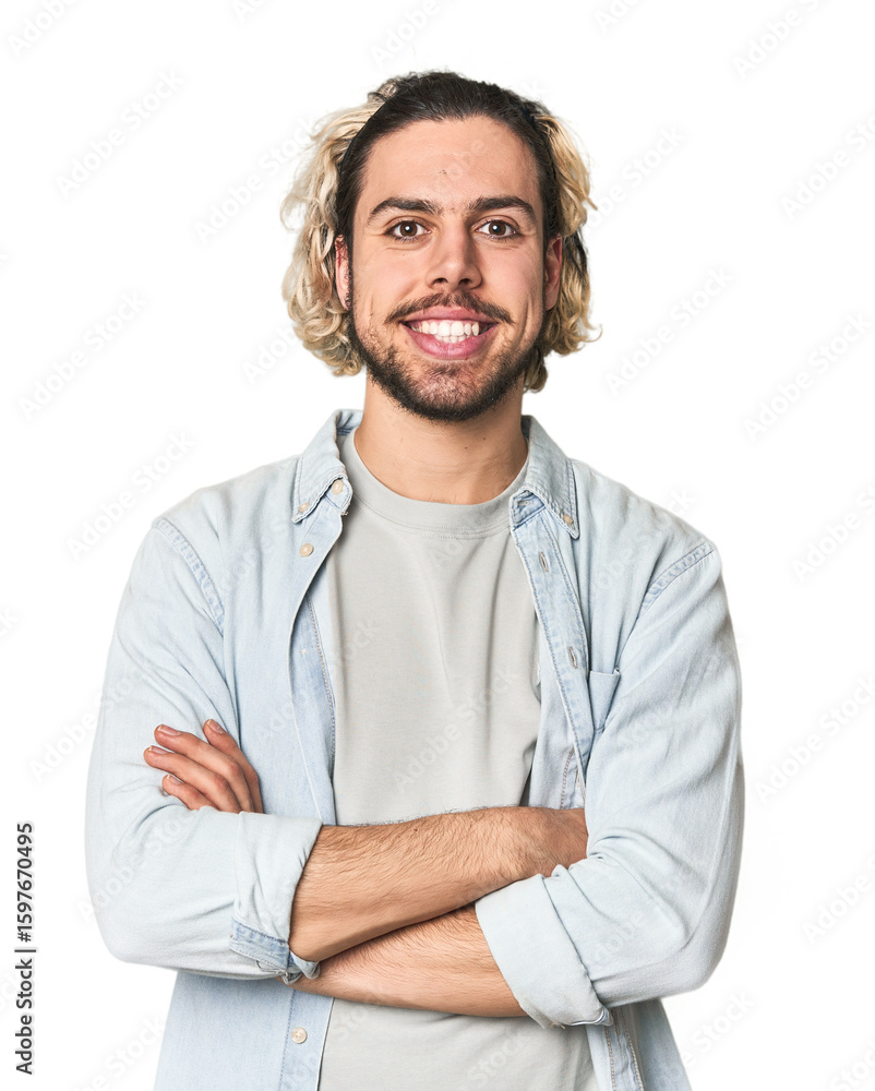 Young Caucasian man in studio setting who feels confident, crossing arms with determination.