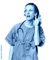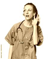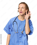 Redhead young caucasian nurse in studio trying to listening a gossip.
