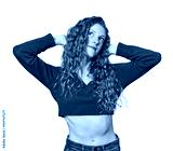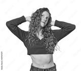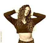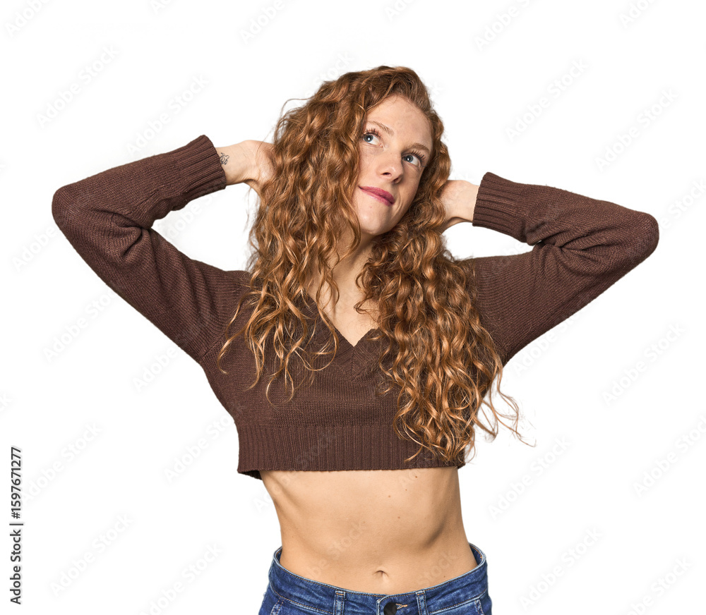 Simple redhead studio portrait feeling confident, with hands behind the head.