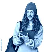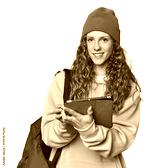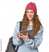 Redhead student with tablet and backpack, studio scene