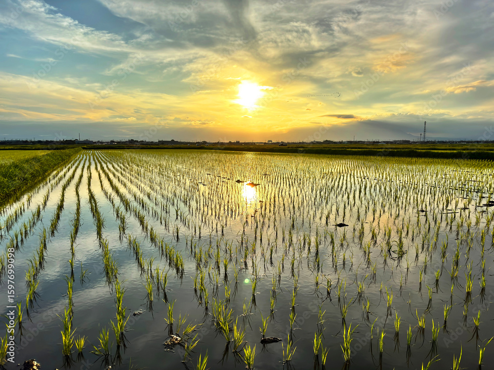 田んぼに反射する夕日3