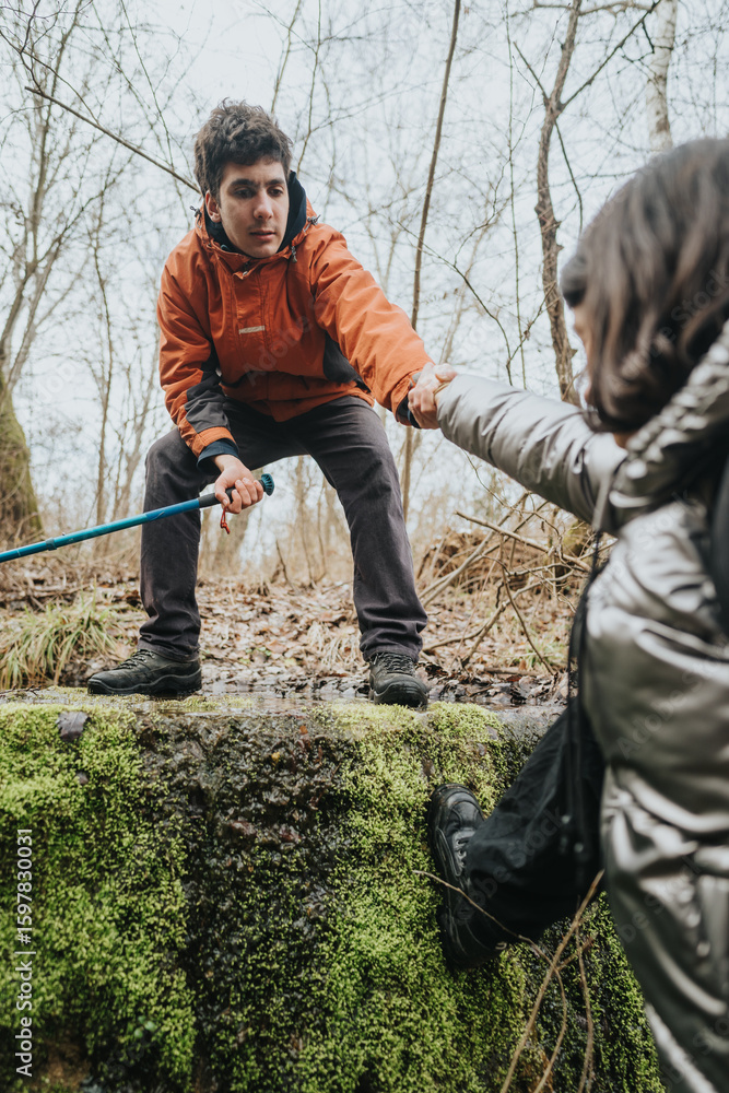 Two people, dressed in outdoor attire, collaborate to overcome a barrier covered in green moss amidst a wooded landscape, exemplifying teamwork and assistance in a natural setting.