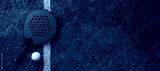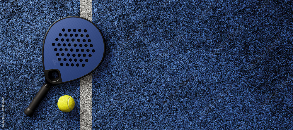 Blue padel racket and yellow ball on textured court near white line, representing active sport hobby and dynamic game atmosphere background. 3D Rendering