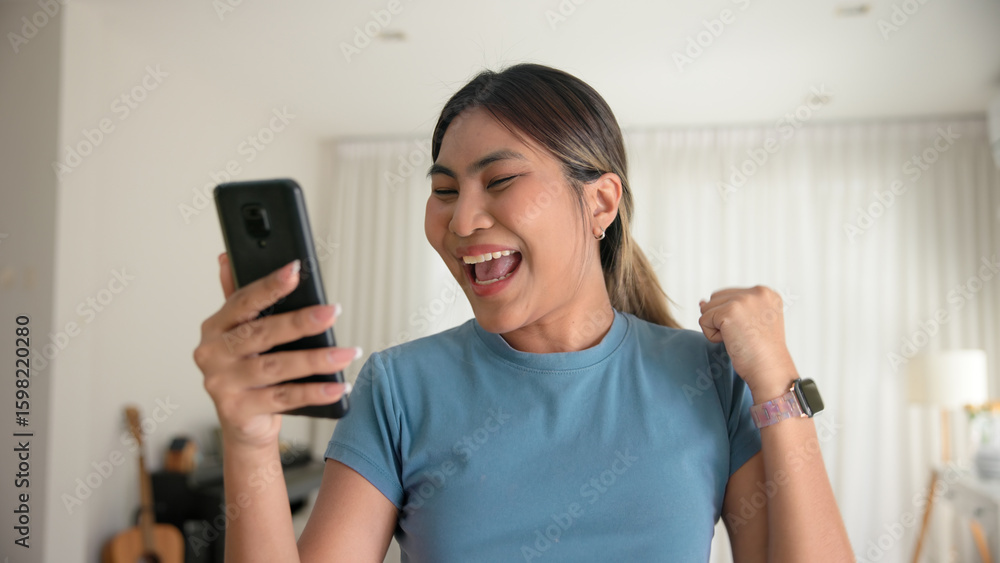 Asia young adult black people humor bizarre funny dance good news at home living room happy joy job hired interview result on mobile, award bonus, win luck bet online game order trade, loan money.