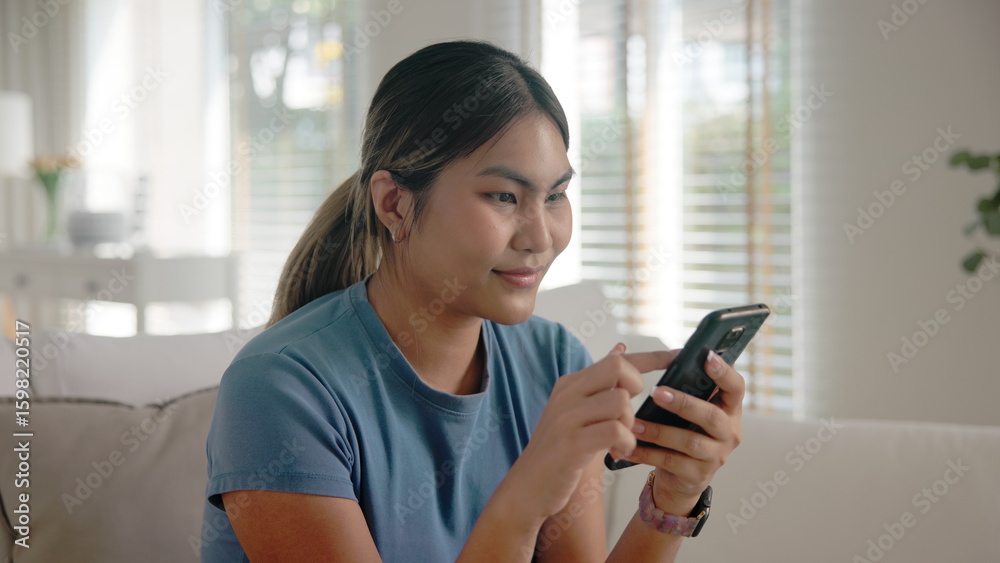 Young adult Gen Z people black asia woman sit at home sofa living room read look at mobile phone relax smile choose lover enjoy play choice right swipe app find love couple AI match flirt chat bot.